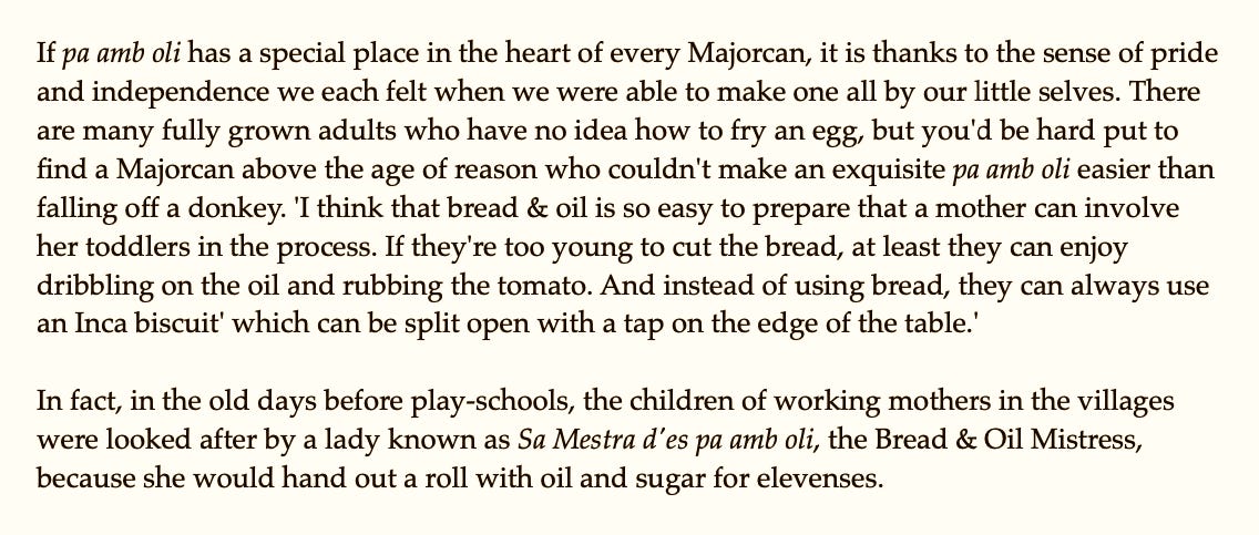 By the way, Bread & Oil by Tomas Graves is a wonderful short book on the simplicity of such food, and Majorcan culture: