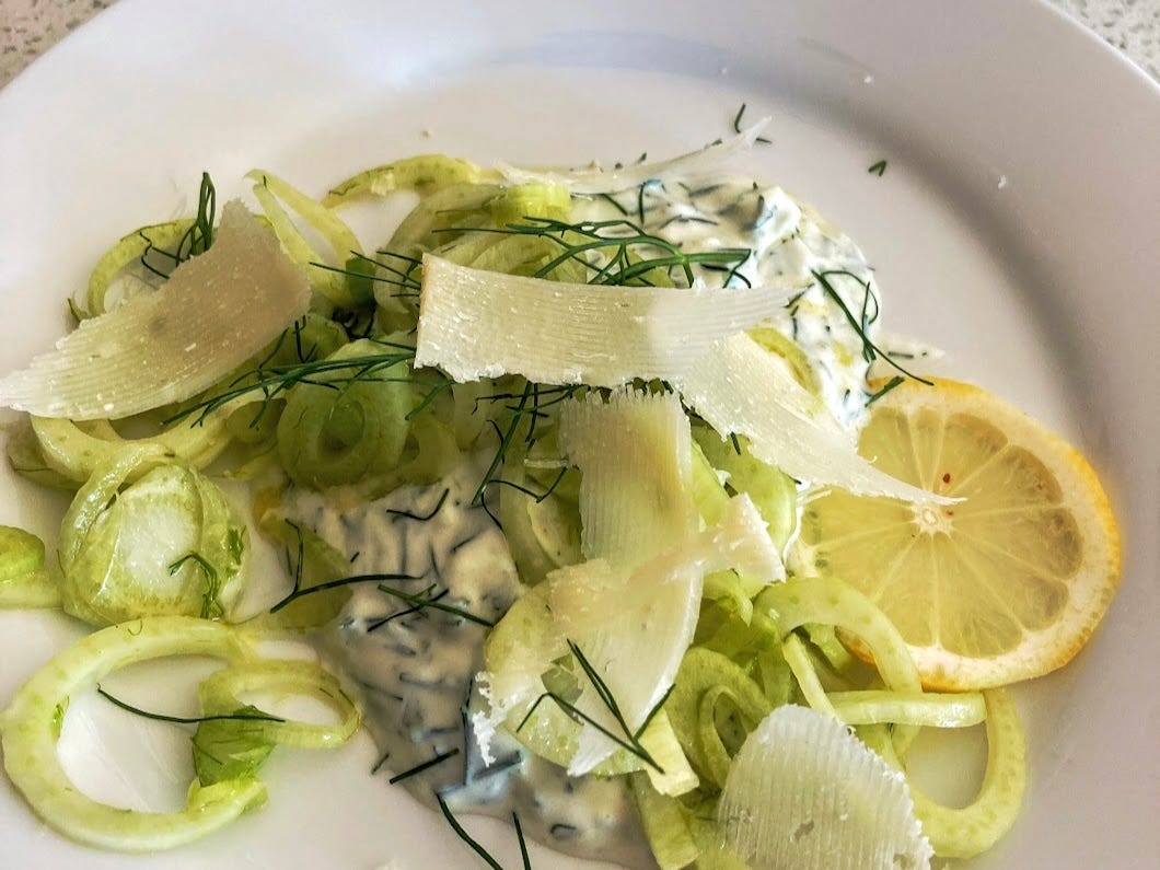 Also this week, a salad from sliced fennel bulbs and greens, tossed with olive oil, salt and lemon, and plopped over yogurt herbed with more fennel greens and garlic, plus a few strips of a nice parmesan found at Mac Market.