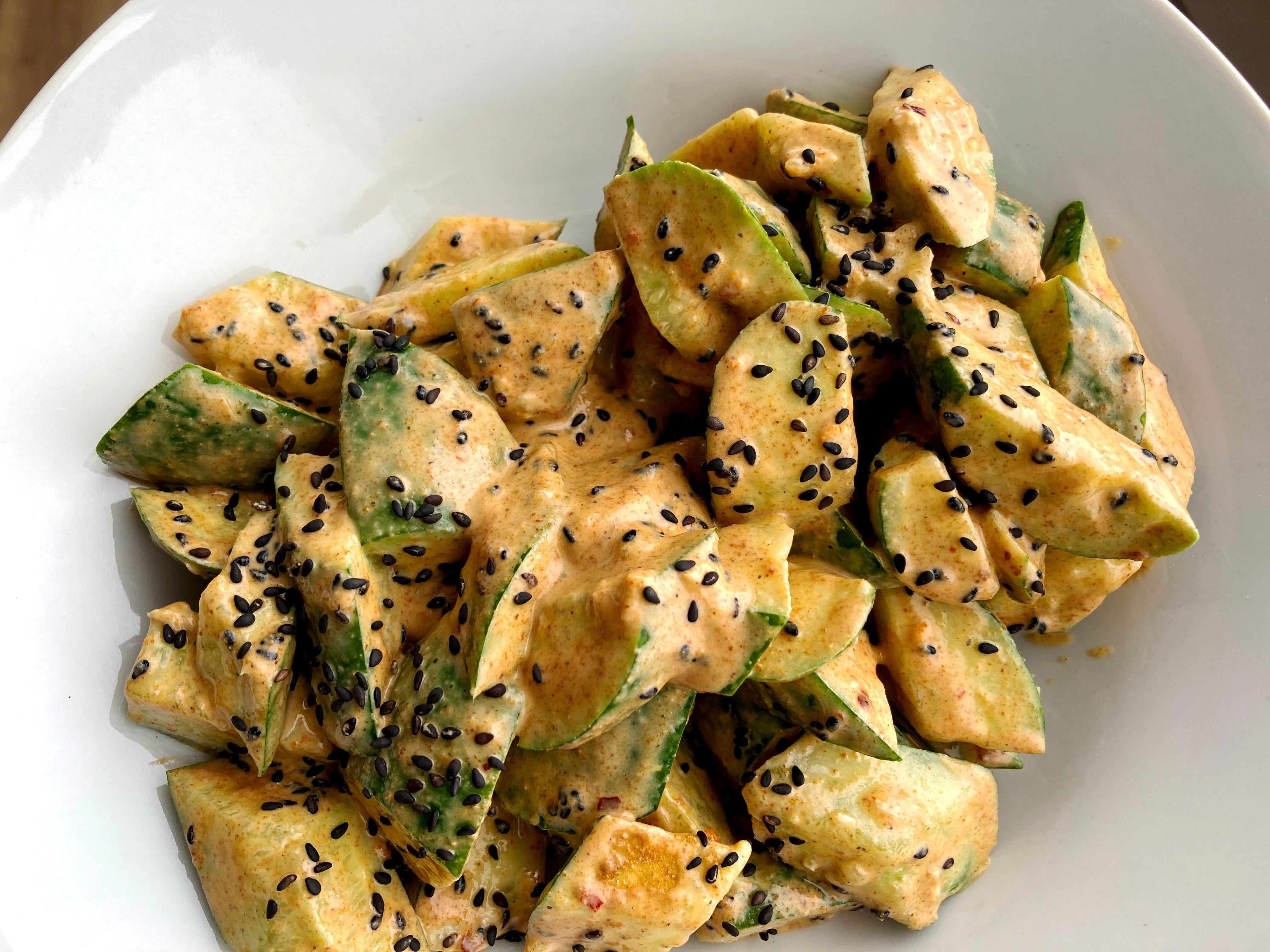 About a tablespoon each of tahini, rice vinegar, sesame oil, and maple syrup, plus some salt, minced garlic, and black sesame seeds. Then, chili oil to taste. I used Momofuku chili crunch which is delicious and versatile. Chop a few small cucumbers into rough bite size chunks, add them to the sauce, and toss to coat.